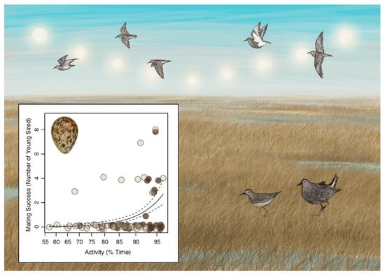 The sun never sets during summer in the high Arctic. In this environment, some male pectoral sandpipers sleep little and are extremely active during the three-week breeding season. Although there was substantial male–male variation in the level of activity, males that slept the least ultimately sired the most offspring (inset from Lesku et al. []). Illustrations by Laura X. Tan.