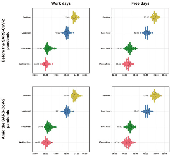 Besides sleep, dietary choices may have also changed as a result of the COVID-19 pandemic and related restrictions. Supporting this assumption, a study from the United Arab Emirates involving 1012 subjects found more unhealthy dietary patterns during the pandemic. For instance, 46.1% of the participants consumed sweets and desserts at least once per day, and 37.1% reported consuming salty snacks (chips, crackers, and nuts) every day) [13]. In addition to diet quality, the timing of food intake may also be relevant to human health. Alterations in feeding time can uncouple the body clocks, leading to circadian misalignment, disruption in homeostasis, and disturbances in many metabolic functions [14,15,16]. Whether the shift of nighttime sleep to later hours during the pandemic has also shifted people’s eating time window toward later hours of the day is unknown. Later eating has been associated with various health outcomes, such as an increased risk of cancer, cardiometabolic complications, reduced efficacy of weight-loss interventions, lower insulin sensitivity, and adverse body composition [17,18,19], although such outcomes may partly be driven by a greater mismatch with fixed work schedules (akin to similar associations observed for those with greater social jetlag).