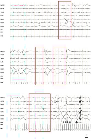 These studies and our findings are in line with basic science work on animals and humans, arguing for progressive and fluid, rather than clear-cut, transitions between vigilance states, and suggesting that falling asleep does not affect the whole brain in a global way [36]. Therefore, intra-cerebral recordings have allowed the observation of an asynchrony in sleep onset between the thalamus, limbic structures, and neocortical area, suggesting that falling asleep is a gradual process [37,38]. Intrusion of sleep during wakefulness, defined as global or local transient slow waves associated with a decrease in the neuronal firing rate, has also been observed in sleep deprivation conditions and has been correlated with performance impairment or “cognitive lapses” [39,40]. The low spatial resolution of scalp EEG performed for PSG purposes did not allow us to look for local specificities in MS episodes; however, these MSs may constitute markers of sleepiness at a macroscale level, reflecting the intrusion of brief periods of sleep during wakefulness before the installation of stable sleep.