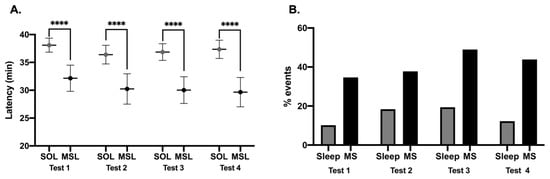 Effect of test time on microsleep and sleep episodes. Test 1 is performed at 9:00 a.m., Test 2 at 11:00 a.m., Test 3 at 1:00 p.m., and Test 4 at 3:00 p.m. (A) Mean microsleep latency (MSL) and sleep onset latency (SOL). Latencies are presented as mean with 95 CI. The MSL (black dot) is always significantly shorter than the SOL (grey dot). No significant difference between the 4 tests is observed. (B) Proportion of patients who fell asleep (MS or sleep) for each test. No significant difference between the 4 tests is observed. **** p < 0.05.