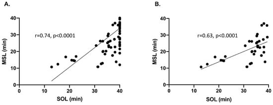 The mean SOL calculated over the four tests in was 37.2 (±5.7) min (median 40.0, min 12.9 max 40.0), with 16 patients exhibiting with a mean SOL below 34 min and only three patients with a mean SOL below 20 min (medico-legal threshold in France). One MS was observed during at least one of the four tests in 62.2% of the patients. The mean MSL during the four tests was 30.6 (±9.8) min (median 34.0, min 10.7 max 40.0), with 49 patients exhibiting with a mean MSL below 34 min and 15 patients with a mean MSL below 20 min. The mean MSL among patients who had MSs was 24.8 (±8.4 min). The MSL was significantly positively correlated with the SOL (r = 0.74, 95% CI (0.63; 0.82), p < 0.0001) (Figure 3).