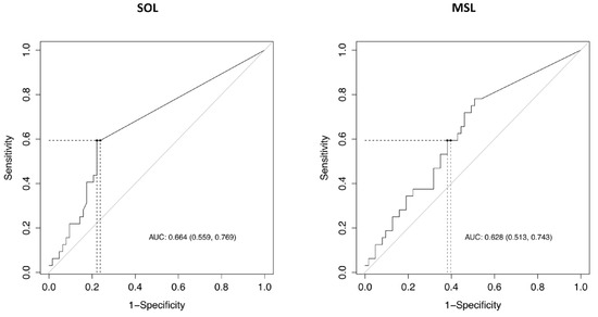 The ROC curves for the diagnosis of excessive daytime sleepiness as assessed by the ESS are presented in Figure 4 and show a similar performance for the MWT whether the test is interpreted with or without the MSs. The areas under the ROC curve for the prediction of sleepiness were 0.66 95% CI (0.56, 0.77) for SOL and 0.63 95% CI (0.51, 0.74) for MSL. Sensitivities, specificities, and positive and negative predictive values according to the selected thresholds are detailed in Table 4. Overall, high specificities were obtained for SOL < 34 min and for MSL < 20 min.
