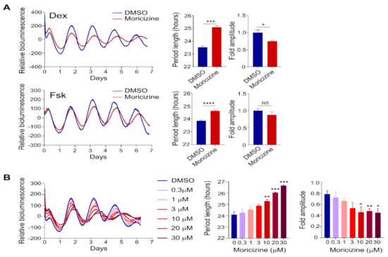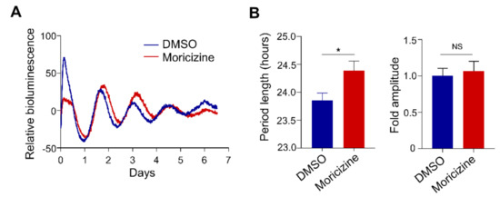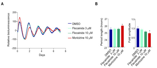 Real-time circadian bioluminescence monitoring was conducted by using adult mouse ear fibroblast cells isolated from Per2::LucSV knock-in mice by replacement of the 3′-UTR with an SV40 late poly(A) sequence as described [59]. Cells were grown to confluency on 35 mm dishes in Dulbecco’s Modified Eagle’s Medium (DMEM) medium supplemented with 10% Fetal Bovine Serum (FBS) and 1% penicillin/streptomycin, and subsequently synchronized with 200 nM dexamethasone (Dex) for 1.5 h or forskolin (Fsk, 1 or 5 µM) for 1 h [37,41,59]. Moricizine (Sigma–Aldrich or Santa Cruz) was then added at concentrations of 0 (vehicle control), 0.3, 1, 3, 10, 20, and 30 µM, or Flecainide (Sigma-Aldrich) at 3, 10, and 30 µM, along with luciferin-containing recording media. The dishes were then tightly sealed with vacuum grease and placed in a LumiCycle luminometer (Actimetrics) for continuous bioluminescence monitoring over six days. The data were detrended using a first-order polynomial, then best-fit to a sine wave estimated by a Levenberg–Marquardt algorithm for measurement of circadian parameters in the LumiCycle data analysis program (Actimetrics).