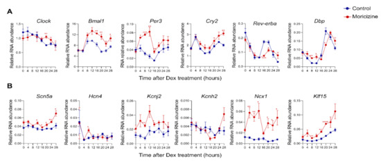 Real-time qPCR analysis of circadian and cardiac gene expression. Circadian ((A); Clock, Bmal1, Per3, Cry2, Rev-erba, and Dbp) and cardiac ((B); Scn5a, Hcn4, Kcnj2, Kcnh2, Ncx1, and Klf15) gene expression in Per2::lucSV reporter cells quantified by qPCR for control (blue) and moricizine 20 µM (red). Data are shown as mean ± SEM every 4 h for 28 h (n = 3). T-test shows the significant statistical differences between DMSO and moricizine at the indicated time points. Two-way ANOVA analysis shows significant differences between DMSO and moricizine for Bmal1, Cry2, Per1, Per3, Scn5a, Kcnj2, Ncx1, and Klf15. (*, p < 0.05; **, p < 0.01; ***, p < 0.001; ****, p < 0.0001).