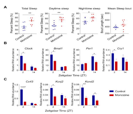 Acclimated mice were treated by daily IP injection (1.25 mg moricizine per mouse in 100 µL PBS, or 100 µL PBS alone for the control group) for five days. We chose to inject at ZT2 to minimize acute effects of light on at ZT0, also considering the relatively short half-life of moricizine [24,25]. Sleep/wake recording was performed with a noninvasive piezoelectric transducer sleep/wake recording system (Signal Solutions, Inc., Lexington, KY, USA) as previously described (Nohara et al., 2019). The initial 48 h acclimation period was followed by data recording for five days. Data were extracted and analyzed by using the Sleepstats software [43] (Signal solutions, Inc., Lexington, KY, USA).