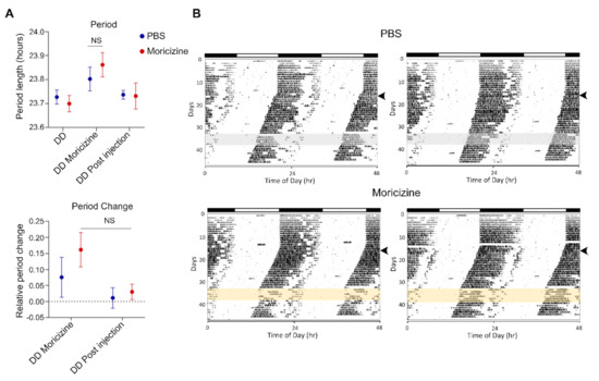Finally, to determine the effect of moricizine on mouse voluntary wheel-running behavior, WT C57B/6 mice were allowed to free-run in constant darkness before moricizine was IP injected at circadian time 11 (CT11), just before activity onset (CT12), for five days. As shown in Figure 6A (summary data) and Figure 6B (representative actograms), while the free-running periods were virtually identical before and after treatment (DD and DD Post injection, respectively), there was a slight trend, without reaching statistical significance, of period lengthening and phase shift during the treatment (DD moricizine). Finally, moricizine treatment also led to a marginal effect on circadian activity pattern (Figure S7A) and total activity (Figure S7B), although again not reaching statistical significance.