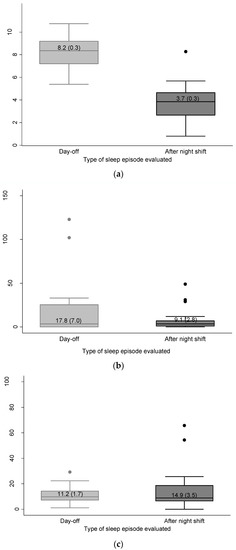 Mean sleep duration was higher on the day-off (nocturnal sleep) than after the night shift (diurnal sleep). There was no significant difference for mean sleep onset latency (SOL) and mean wake-up after sleep onset (WASO) between the two groups (after night work and day-off) (Figure 1).