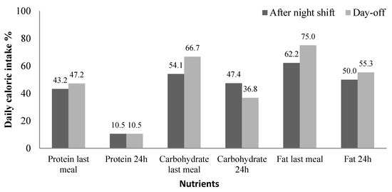 Percentage of participants with inadequate daily macronutrient intake for 24 h period and last meal before bed, after night shift (n = 30), and on day-off (n = 22). t-test, p > 0.05.