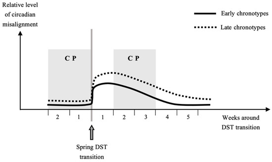 - Kantermann, T.; Juda, M.; Merrow, M.; Roenneberg, T. The human circadian clock’s seasonal adjustment is disrupted by daylight saving time. Curr. Biol. 2007, 17, 1996–2000. [Google Scholar] [CrossRef]