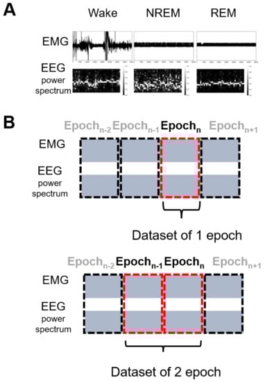 In addition to the human PSG, considerable demand exists for research on rodent sleep data. Rodents also have a sleep–wake cycle consisting of different sleep stages. However, there are some significant differences compared with humans. First, nocturnal rodents tend to get more sleep in the light period compared with humans, who sleep in the dark period. Second, unlike human sleep which is monophasic and repeats the NREM–REM sleep cycle (lasting about 90 min) three to six times successively only during night, the sleep of rodents is polyphasic and occurs both during the day and night time, and does not usually repeat the NREM–REM sleep cycle (lasting for several minutes to longer, irregular duration) successively. Third, the NREM sleep of rodents is not subdivided, unlike humans. Normally, all sleep states, excluding REM, are regarded as NREM. As a result, the rodent sleep cycle is relatively shorter, not continuous, fragmented, and unstable to external environmental changes. Nonetheless, rodents are a great model to understand human sleep, and a simple and reliable method to classify their sleep stage is required. In the specific representation of electrophysiology, the classification criteria of the sleep stages of mice are different from human PSG classification. The murine non-rapid eye movement (NREM) stage shows low EMG amplitude and high EEG δ-wave power, and NREM is classified as one stage without any further subdivision. The REM stage shows a higher θ-wave power than any other frequency band. Thus, three sleep stages, namely wake, NREM, and REM, have typical individual features on the EEG power spectrum. Researchers of murine sleep usually use an automatic scoring commercial software, such as SleepSign (Kissei Comtec Co. Ltd., Matsumoto, Japan) [] or a MATLAB advanced toolbox such as EEGLAB []. However, these processing tools may present some obstacles for new researchers due to the cost or the requirement for high-level programming skills. Furthermore, due to the shorter sleep cycle and the relative unstableness of the sleep stage in mice, the one-epoch length is usually set shorter compared with humans, usually being shorter than 30 s.