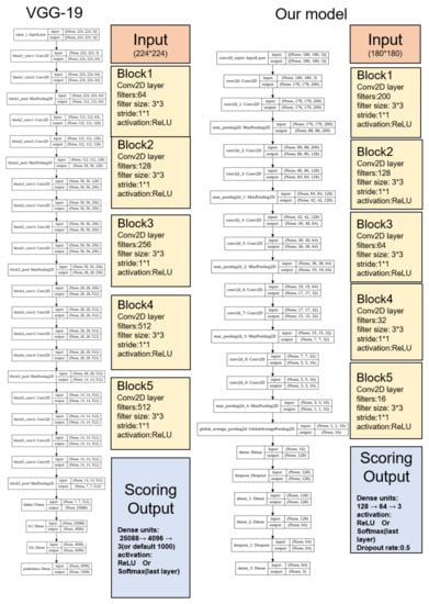 For preliminary work, to confirm whether the sleep scoring using the created images worked effectively, we constructed our own small image dataset using EEG and EMG data from C57BL/6J mice. In this trial, the input size of the images was set to 800 × 800 pixels. After trying some transfer learning models such as DenseNet (accuracy = 53%), MobileNet (accuracy = 67%), and ResNet (accuracy = 78%) on our dataset, we found that VGG-19 (accuracy = 94%) had good potential. In order to reduce the amount of data to be calculated, we tried to reduce the input size and found that the performance could still be maintained at 180 × 180. The structure was quite similar to VGG-19 in that both have five blocks of 2D-CNN to extract the image information. We then added four dense layers and two dropout layers at the ends of the networks to prevent overfitting (Figure 2).