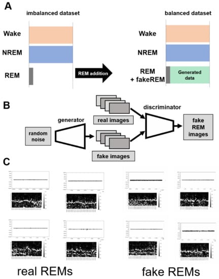 Expansion of the dataset using fake images. (A) Schematic representation of WGAN-GP-based image expansion. Bottom left shows the true image and the bottom right is the fake image generated based on the dataset. (B) Modified DCGAN (deep convolutional generative adversarial network) structure. High-resolution images (512 × 512) will be generated in our model. (C) Real REM sleep and fake REM images.