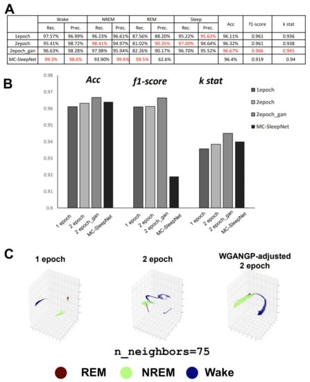 To understand more intuitively how our classifier recognizes the interrelationships between the three stages within the model, we extracted the output information from both the first (128) and last (64) dense layers. The first dense layer is thought to collect all the feature information extracted from the CNN, while the last dense layer integrates all the information for the final classification. As that information is high-dimensional, to clearly see the distribution of each stage within the classification processing, a dimensionality reduction is necessary. UMAP (uniform manifold approximation and projection) is an effective dimension reduction and clustering tool. We embedded the output information of these dense layers into three components and visualized them in 3D space. We changed the parameters of n_neighbors from 5 to 100 (Supplementary Figure S1). The results were significant. When n_neighbors were set at 75 (Figure 5C), on the first dense layer, the three datasets showed variant distributions for the network and behaved consistently with scoring performances such as precision or recall. For the one-epoch dataset, the wake and sleep stages were completely separate, but many cases of NREM near to REM were observed, which is why the precision of sleep on the one-epoch dataset was the highest (Figure 5C, left). On the two-epoch dataset, REM exhibited a stick-like clustering and was connected with NREM, which matched the reality, as all phase-transition points of the sleep-activity cycle could be presented. NREM is always ahead of REM in a time series, so REM is only connected to NREM, but not wake (Figure 5C, center). The most exciting aspect was the performance on the WGAN-GP-adjusted dataset. As the fake REM data balanced the entire dataset, even the NREM and wake stages were in remarkable balance with each other, whereas the REM closely resembled a small branch growing on NREM, which was consistent with reality. Wake also became closer to REM, which could be regarded as the mid-wake points during sleep that often occur after REM (Figure 5C, right).
