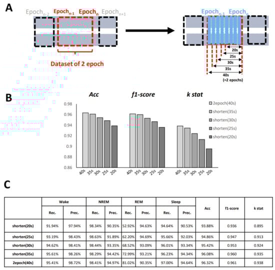 Another advantage of using images for judgment is that even images with missing information can also be recognized. To test the performance on non-standard datasets, we created images of different epoch lengths. As Figure 6A shows, we shortened the epoch length from 40 s (two epochs) to 20 s (one epoch) by 5 s, and then classified the images using our algorithm. The accuracy gradually decreased with the shortening of the epoch length, but even the shortest version (20 s) showed good performance (accuracy = 93.88%, κ = 0.8954) (Figure 6B,C). This indicated the robustness of our algorithm, and that it could be helpful in specific situations, such as with small-scale data breakage or short-term sampling instability. All of the shortened version results revealed a high grade of recall for the NREM and wake states, whereas the recall for REM showed an expected gradual decline with the shortening of length.