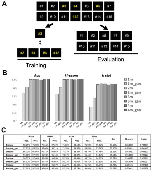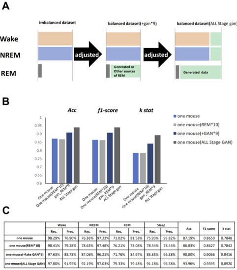 To improve the single-mouse data performance, we increased the number of images in all three stages by generating fake images of the wake, NREM, and REM stages (Figure 8A). On a tiny dataset of a single-mouse segment, the accuracy increased when we expanded all three-stage data with fake images (Figure 8B,C). Although the accuracy of 93.96% remained unsatisfactory, this value was still quite impressive for such a tiny dataset. In order to confirm if GAN is better than a simple increase in REM images, we tested another dataset with the simple addition of 10 times the number of REM images within a single mouse dataset, and the result was not improved at all.