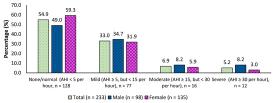 Two hundred and thirty-three individuals participated in the project. Of these, 98 (42.1%) were males and 135 (57.9%) were females. Mean age was 38 years (SD = ±15 years) and mean body mass index was 31 Kg/m2 (SD = ±8 Kg/m2). The mean duration for Apnea Link evaluation was 356 min (SD = ±135 min). Among those, 105 (45.1%) had an AHI index ≥5, which is mild to severe OSA, and 28 (12.1%) had a moderate to severe OSA (AHI ≥ 15). The proportion of AHI index ≥ 5 in males was 51.0% and in females was 40.7%. The prevalence of severe OSA was more than two times higher in males than in females. This is shown in Figure 1.