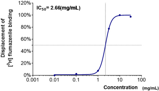 As shown in Table 1, the displacement of [3H]-flumazenil (GABAA–BZD antagonist) binding was obtained for water extracts of medicinal plants at six concentrations. WCR showed the highest binding affinity to the GABAA–BZD receptors, which replaced over 80% of the [3H]-flumazenil binding at a concentration of 20 mg/mL. The IC50 value of WCR was 2.66 mg/mL (Figure 1). The water extract of Polygonum multiflorum Thunberg (WPmT) had a weaker but dose-dependent binding activity to GABAA–BZD receptors. Moreover, water extracts of Bupleuri Radix (WBR) showed medium dose-dependent binding affinity to GABAA–BZD receptors.