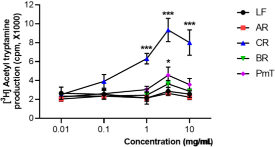 The effects of water extracts of medicinal plants on the AANAT activity in the pineal cells are shown in Figure 3. The activity of AANAT was expressed in terms of the control activity. Treated WCR (n = 3) robustly and dose-dependently increased the AANAT enzyme activity in pineal cells compared with the baseline level (0.1~100 mg/mL, *** p < 0.001, significantly different compared with the baseline level, respectively).
