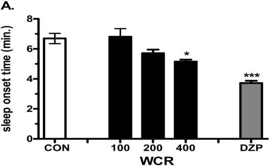 In conclusion, WCR displayed differential binding affinities for GABAA and 5-HT2C receptors and stimulated AANAT activity in pineal cells. WCR also produced sedative–hypnotic activity in the pentobarbital-induced sleep test using mice. Moreover, WCR reduced sleep latency and advanced the amount of NREM sleep without altering REM sleep or the EEG power density during NREM sleep in rats. Taken together, these results suggest that WCR is a good candidate as a herbal agent for treating disturbed sleep.