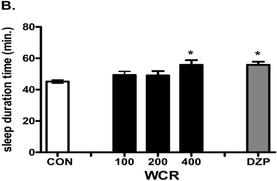 2.4. The Effect of WCR on Pentobarbital-Induced Sleep in Mice