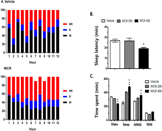 (A) Sleep–wake pattern in rats treated with the vehicle or WCR. (B) Effect of WCR on sleep latency. (C) Time spent in wake, total sleep, NREM sleep, and REM sleep after WCR administration. Each column represents the mean ± SEM. * p < 0.05, ** p < 0.01, *** p < 0.001, significantly different compared with the vehicle group. ANOVA followed by Tukey’s test. The CON group: treatment with the vehicle; the WCR groups: treatment with WCR (200 or 400 mg/kg).