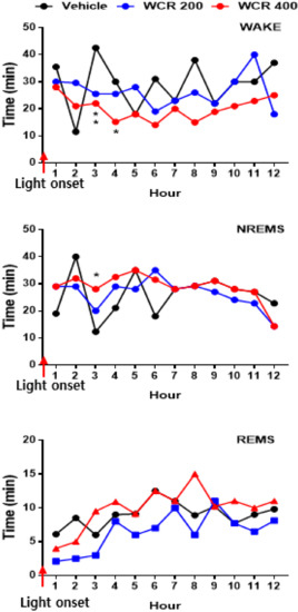 Time course of wake, NREM sleep, and REM sleep after treatment with WCR. Each circle displays the hourly mean ± SEM. * p < 0.05, ** p < 0.01, significantly different compared with the vehicle group. ANOVA followed by Tukey’s test. The CON group: treatment with the vehicle; the WCR groups: treatment with WCR (200 or 400 mg/kg).