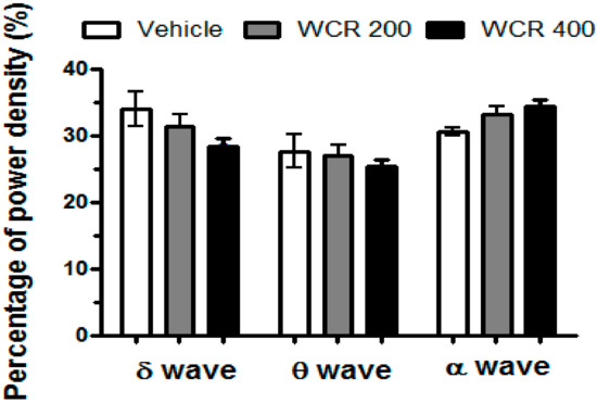 Effects of WCR on the EEG power during NREM sleep. The EEG power densities during delta, theta, and alpha wave activities for NREM sleep were measured. The data displays the mean ± SEM of the EEG power density in three selected frequency bands in the NREM sleep stage. The CON group: treatment with the vehicle; the WCR groups: treatment with WCR (200 or 400 mg/kg).