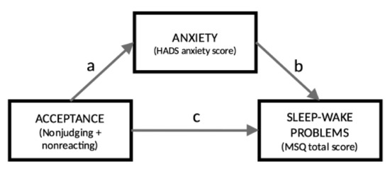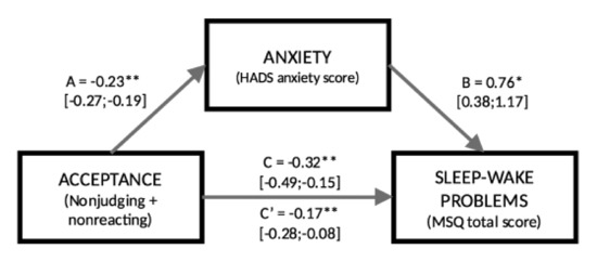 2.2. Anxiety Mediates the Effect of Acceptance on Sleep–Wake Problems