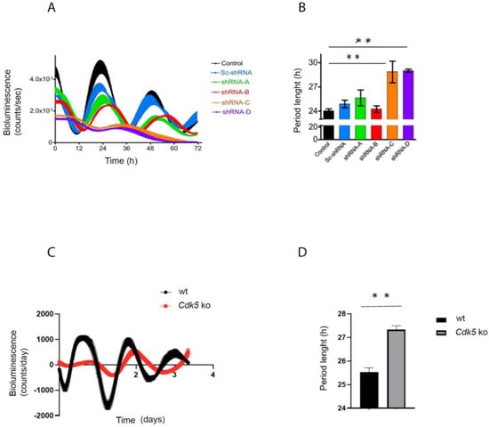 2.1. Lack of CDK5 Lengthens the Period Length of a Peripheral Clock