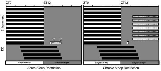- Mistlberger, R.E.; Landry, G.J.; Marchant, E.G. Sleep deprivation can attenuate light-induced phase shifts of circadian rhythms in hamsters. Neurosci. Lett. 1997, 238, 5–8. [Google Scholar] [CrossRef]