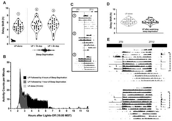 Animals were demonstrably active during the period in which mechanical perturbation was applied (and remained so for approximately 2 h after the gentle shaking had stopped; Figure 2B); however, the average delay shift observed in rested versus unrested flies was not statistically different (mean ± SEM; light pulse alone, 4.83 ± 0.19 h; light pulse and 1 h sleep deprivation, 5.43 ± 0.30 h; light pulse and 4 h sleep deprivation, 5.21 ± 0.29 h; F3,113 = 1.595, p = 0.1946; representative actograms provided in Figure 2C). Results were similar in Drosophila that had been partially sleep-restricted for a week before light exposure (Figure 2D,E; Dunnett’s multiple comparisons test, p > 0.99). The magnitude of delay shifts recorded in animals enduring several nights of limited sleep opportunity (4.80 ± 0.17 h) were not distinguishable from either those experiencing short-term sleep restriction or those with a normal sleep history before and after the light pulse.