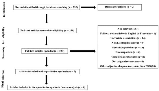 Observational studies were defined as of any design (cross-sectional, retrospective or longitudinal) that evaluated humans of any age, gender or race/ethnicity from the general population. The article had to include an objective measure of SES, such as education, income, assets, occupation, employment status and composite index, as well as perceived SES, self-reported by participants. Proxy measures of SES (neighborhood SES or area deprivation indices) were also included when individual data was not available. For studies examining children or adolescents, perceived family SES measures such as parental education, parental profession or household income were used instead. The investigation also needed to include a polysomnography-based measure of sleep and potential moderators such as AHI (apnea–hypopnea index). Studies were excluded based on the following criteria: (1) They were interventional trials, reviews or meta-analyses, case series or case reports and/or did not present original research, (2) they were not written in English or French, (3) the full text was not accessible, (4) authors/researchers recruited participants that already presented specific conditions at baseline (for example individual with cancer, shift-workers, children with cerebral palsy, etc.), (5) they did not provide statistical significance in cases where either SES or sleep were evaluated as covariates or mediators and (6) researchers used actigraphy instead of polysomnography.