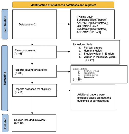 We included observational studies, defined as case–control studies and cohorts, conducted on humans and written in the English language. Animal studies were excluded. We excluded papers that did not fulfill the aims of our study. After screening the studies, we included papers with one of the following characteristics: (1) patients with KLS; (2) intervention: use of functional imaging to evaluate the patients such as fMRI, SPECT; (3) comparator: there was not a comparison because of the low prevalence of the disease; and (4) outcomes: areas of the brain with hypo/hypermetabolism, hypo/hyperactivity, during episodes and between the episodes of KLS.