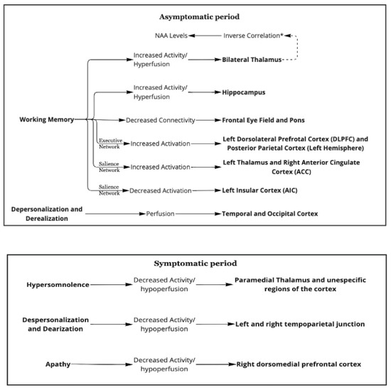 Three studies showed increased thalamic activity during the asymptomatic period, correlating with working memory task deficits using fMRI [15,22,23]. Hyperactivity of the thalamus during the symptomatic period could be explained as a compensatory mechanism [23]. Both studies were related to decreased working memory tasks, which contrasts with the symptomatic period where hypometabolism is found [13].