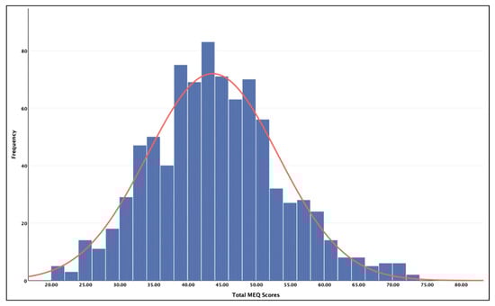 The mean scores for the chronotype preference and each personality trait are presented in Table 1. The normality of the MEQ data was assessed using a histogram, which indicated the distribution to be skewed in favor of eveningness (see Figure 1). More specifically, 7.1% of the sample indicated a morning preference, 51.2% an intermediate preference, and 41.8% an evening preference.