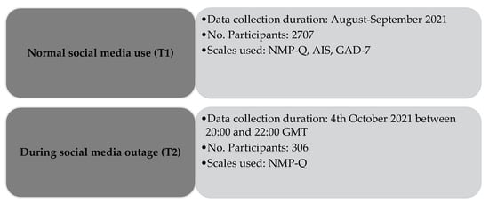 Crowdsourcing platforms like Amazon Mechanical Turk are not traditionally used for research in some countries. Although crowdsourcing involves soliciting volunteers through an open call, the process is now being called ‘social media crowdsourcing’ [] owing to the widespread use of social media platforms to solicit volunteers. Ninety-six studies in a systematic review and meta-analysis showed that crowdsourcing approaches can be a viable and effective means of improving knowledge []. Using social media and mobile phone short messaging services, we mimicked a crowdsourcing platform by soliciting responses to self-administered, structured questionnaires from a large pool of participants. A longitudinal study design was used to collect data for the present study. The present report is part of a large ongoing study that examines the longitudinal association between nomophobia and psychological disorder. Data for the current research were collected at two different time points: data were collected from each participant at baseline (T1 = during normal social media use, i.e., August–September 2021) and again from a subset of the T1 participants during a major social media network outage (T2 = Monday, 4 October 2021, between 20:00 and 22:00 GMT).