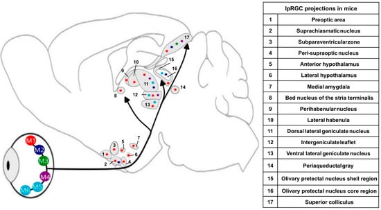 Schematic of main ipRGC projections in mice. Adapted with permission from [,]. Information from [,,,]. Numbers of the scheme correspond to numbers in the adjacent table. Coloured dots correspond to known projection of ipRGCs subtypes in rodents (M1 to M6).