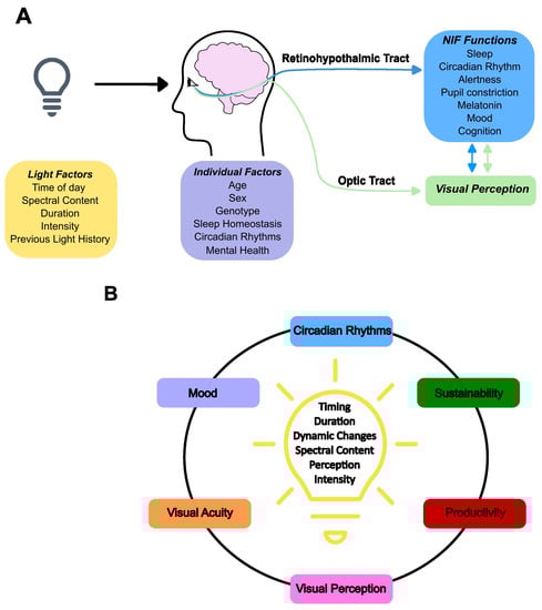 Light’s impact image forming (IF) and non-image forming (NIF) pathways. (A) Light signal reaches the central nervous system via the retinohypothalamic and optic tracts of the optic nerve to affect IF and NIF functions. Light impact on NIF functions depends on light factors and individual factors. (B) The industrial concept of integrative lighting aims to design individually tailored dynamic lighting accounting for visual perception and acuity, together with light’s impact on NIF functions, including mood, circadian rhythms, productivity (i.e., attention/alertness), and environmental sustainability. NIF’s consideration of integrative lighting largely lacks a strong scientific basis.