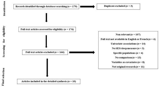 Descriptive synthesis. Ten articles [14,15,16,17,18,19,20,21,22,23] were included in the final sample (Table 1). They were all cross-sectional studies and published between 2006 and 2019. Among these studies, 50% (n = 5) were performed in Saudi Arabia and 50% (n = 5) in Iran. The combined number of participants was N = 39,550 participants, composed of 69.35% children and adolescents (n = 27,429, mean age = 9.8 years old) and 30.65% adults (n = 12,121, mean age = 46.3 years old). The smallest sample was N = 715 and the largest were N = 13,486. The socioeconomic indicators used were perceived SES/composite indices, education, income, marital status and employment/occupation. In all the studies, sleep variables were reported using self-reported questionnaires. The studies conducted in Iran assessed principally the risk of obstructive sleep apnea (OSA), while those in Saudi Arabia were interested in sleep duration, nap time, bedtime, rise time and insomnia.