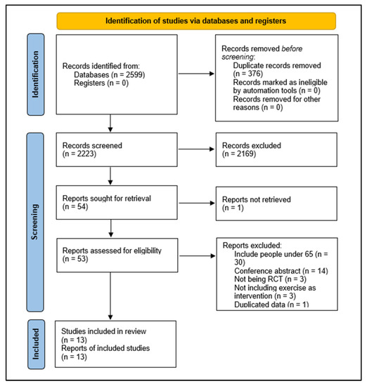 The initial search yielded 2599 potential studies. In total, 376 duplicate records were deleted. We screened 2223 titles and abstracts and excluded 2169 records that did not meet the inclusion criteria. Fifty-four of these were assessed as full text. Of these, 30 were excluded for including people under 65 years old, 14 for being conference abstracts, 3 for not being RCTs, 3 for not including exercise as intervention, and 1 for duplicated data. Ultimately, 13 studies met the criteria for eligibility and were included in the review [32,33,34,35,36,37,38,39,40,41,42,43,44]. The flow chart of the study selection process is shown in Figure 1.