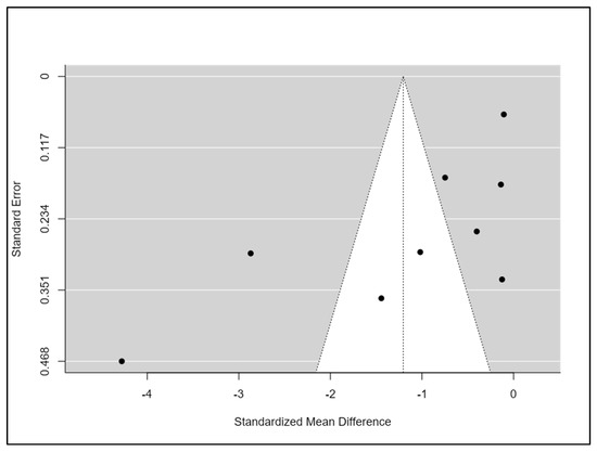All studies had a high or unclear risk of bias in at least one domain. The majority of studies claimed to be randomised. However, only half of them explain how the randomisation was conducted [34,35,38,40,41,43]. No study reported that participants and personnel were blinded. However, this is a common feature in non-pharmacological studies, particularly in rehabilitation studies, in which it is complex to blind professionals or patients due to the nature of the intervention. One-third of studies reported that researchers and outcome assessments were blinded [35,37,38,40]. Five studies had a low risk of bias on attrition rates and selection reporting [34,35,38,41,43]. Finally, the majority of the studies had a low risk of other potential sources of bias (Figure 2). Funnel plots and Begg’s and Egger’s tests indicated a publication bias for the estimation of the effect of exercise on sleep quality (Begg = 0.08; Egger = 0.009) (Figure 3).