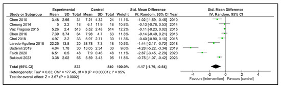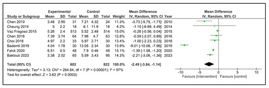 Sleep Quality: A total of 13 studies reported sleep quality [32,33,34,35,36,37,38,39,40,41,42,43,44]. The instruments used were the PSQI [32,34,35,36,38,40,41,42,43], the Oviedo sleep questionnaire [44], the quality sleep score [33], the sleep dimension of Nottingham health profile (n = 1) [39], and an accelerometer/actigraphy [35,37]. A meta-analysis was pooled with nine studies [32,34,35,36,38,40,41,43,44]. These studies compared 822 patients in the intervention group (IG) versus 840 in the control group (CG). Older people in the IG had an SMD of −1.17 points (95% CI −1.79 to −0.54) in comparison to CG (p = 0.0002) (Figure 4). The heterogeneity of the comparison was high (I2 = 95%). If we analysed only the studies with PSQI [32,34,35,36,38,40,41,43], there were 802 patients compared in the IG versus 822 in the CG. Older people in the IG had an MD of −2.49 points (95% CI −3.84 to −1.14) in comparison to CG (p < 0.0001) (Figure 5). The heterogeneity of the comparison was high (I2 = 98%). The certainty of evidence, according to the GRADE methodology, was moderate. Although four studies [33,37,39,42] could not be pooled due to the way they reported the results, it is important to note that three of the four reported an improvement in sleep quality after the intervention [33,39,42].