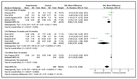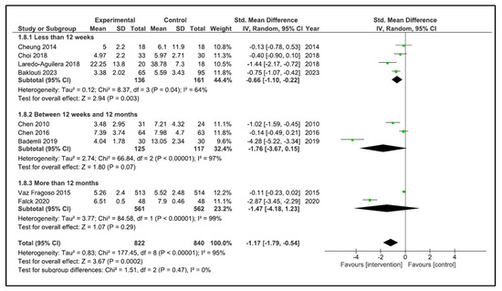 When performing the analysis by time duration, the programs with duration less than 12 weeks improve the sleep quality (SMD −0.66, 95% CI −1.10 to −0.22, p = 0.003) with a high heterogeneity (I2 = 64%). However, the programs carried out between 12 weeks and 12 months (SMD −1.76, 95% CI −3.67 to 0.15, p = 0.07) and more than 12 months (SMD −1.47, 95% CI −4.18 to 1.23, p = 0.29) did not improve sleep quality. The heterogeneity was high in both cases (I2 = 97, and I2 = 95%, respectively) (Figure 6). If we analysed by time duration, but including intermediate assessment points of high-duration programs, the programs between 12 weeks and 12 months improve the sleep quality (SMD −1.94, 95% CI −3.51 to −0.38, p = 0.02) with a high heterogeneity (I2 = 97%), and the programs of more than 12 months (SMD −0.11, 95% CI −0.23 to 0.02, p = 0.09) did not improve sleep quality (Figure 7).