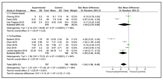 When performing the analysis by setting, the programs carried out at home did not improve sleep quality (SMD −0.95, 95% CI −1.91 to 0.02, p = 0.06). However, the programs carried out in the facilities showed a significant improvement in sleep quality (SMD −1.39, 95% CI −2.45 to −0.33, p = 0.01) (Figure 8). No significant differences were found when performing the analysis by type of training.