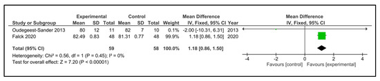 Sleep efficiency: Five studies examined sleep efficiency [32,35,37,38,42]. The instruments used were accelerometry/actigraphy [35,37] and a specific domain of PSQI [32,38,42]. These studies compared 108 participants in the IG versus 100 participants in the CG. The heterogeneity was moderate (I2 = 38%). Older people in the IG had no change after intervention (SMD 0.60, 95% CI −0.12 to 1.31) in comparison to CG (p = 0.10). The heterogeneity of the comparison was high (I2 = 82%) (Figure 9). If we analysed only the studies with an objective measure of sleep efficiency [35,37], there were 59 older people compared in the IG versus 58 in the CG. Older people in the IG had a higher sleep efficiency post-intervention (MD 1.18%, 95% CI 0.86 to 1.50%) in comparison to CG (p < 0.0001) (Figure 10). The heterogeneity of the comparison was low (I2 = 0%). The certainty of evidence, according to the GRADE methodology, was low.