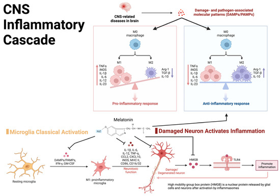 - Ding, K.; Wang, H.; Xu, J.; Lu, X.; Zhang, L.; Zhu, L. Melatonin reduced microglial activation and alleviated neuroinflammation induced neuron degeneration in experimental traumatic brain injury: Possible involvement of mTOR pathway. Neurochem. Int. 2014, 76, 23–31. [Google Scholar] [CrossRef] [PubMed]