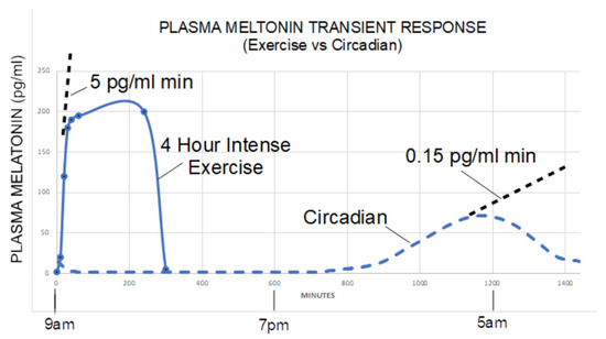 The plasma melatonin levels as a function of time during heavy exercise and circadian time. This figure was from [89] and permitted by the authors. The figure was created based on collated data from Zhu and Theros. The data set does not represent one individual but covers ranges of reported values in different light exposure settings. During a 4-h intense exercise session, plasma melatonin levels rose to 200 pg/mL in 20 min, followed by a plateau for the duration of the exercise (five test subjects with indwelling catheter measured plasma melatonin at 10, 20, 30, 40, 50, 60, 240, and 300 min, respectively).