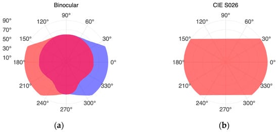 Representations of the human binocular field of view (FOV). (a) The overlapping visual fields of the left (red) and right (blue) eyes, forming the combined FOV. Data digitized based on Guth’s representation [8]. (b) Recommended cutoff angles for the FOV in accordance with CIE S 026:2018 [3], set at +50° and −70°, applicable for indoor environments with low light levels.