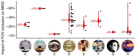 Summary across projects A–H displaying the relative reduction in non-visual stimulus intensity (MEDI) when applying the FOV occlusion versus the conventional method. Red dots represent the median values, with their numerical values to the left. The broader red bars signify the interquartile range (25–75%), while the narrower red lines indicate the range of recorded values. Black dots correspond to individual measurements and are aggregated in 2% bins for visualization.
