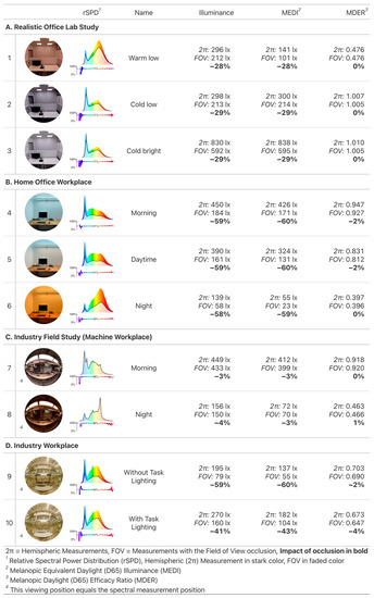 All measurements were conducted at the observer’s eye position and are noted as vertical unless specified otherwise. It is crucial to mention that all scenarios were restricted to artificial light, with no daylight involved, even though some scenarios may be named after different times of the day. The gathered spectral irradiance data were used to calculate key quantities and determine the relative differences attributable to the FOV occlusion (details can be found in Section 4, Materials and Methods). The analysis encompasses illuminance as a visual quantity and Melanopic Equivalent Daylight (D65) Illuminance (MEDI) [3] as a measure for the non-visual stimulus strength. Additionally, the Melanopic Daylight (D65) Efficacy Ratio (MDER) [3] represents the fraction of non-visual to visual quantity.